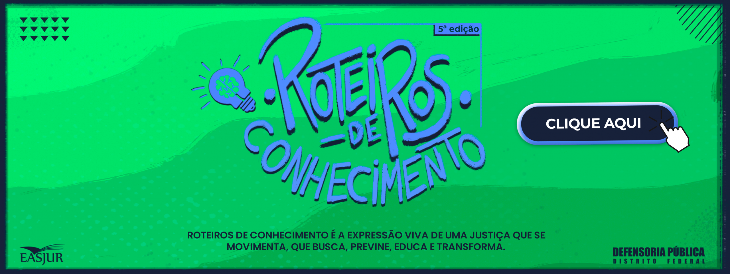A Escola de Assistência Jurídica (Easjur) é um órgão auxiliar da Defensoria Pública do Distrito Federal (DPDF) que busca desenvolver pessoas por meio da produção e disseminação de conhecimento em temas afetos à instituição, à cidadania e aos direitos humanos, visando aprimorar a capacidade de atuação da Defensoria e contribuir para uma sociedade mais crítica e consciente.